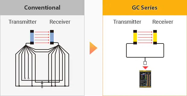 GC系列采用GC-Link,快速连接的钢丝供应界面,适用于Keyence的安全传感器。换句话说,接线是为您完成的。GC-Link的额外福利是它实际上可以监视安全光幕上每个光束的强度。如果强度级别低,则可以分配警报。也有一个功能,即使在级联连接时也会监视每个安全互锁开关的运行状态。